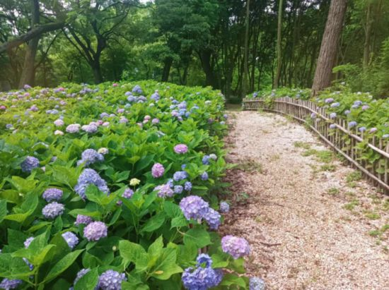 共青森林公园是沪上赏绣球花圣地,拥有六十余种两万余株绣球。2017年打造了沪上首个八仙花主题园,被网友亲切地誉为“魔都版莫奈花园”,2020年在原花艺馆东侧的林下空间打造了一片以无尽夏为主的新八仙花景观区域,成为另一处网红打卡点。